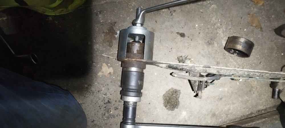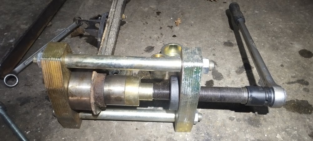 le second m'a donner plus de mal (il avait déjà été changé, et mal orienté d'ailleurs), j'ai du pété 1m de tige fileté de 12mm, avant de me souvenir que j'avais une petite (costaud) presse à rotule de triangle (lien ci dessous) dans un tirroir...(lol)