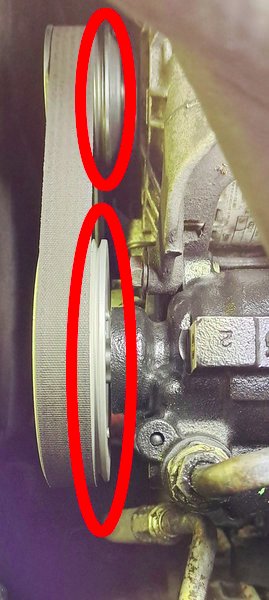 Déposer la poulie de la pompe de direction assistée avec une clé de 10 et en bloquant la poulie avec une clé Allen de 9 (si vous en avez) dans l’axe, ou en bloquant le tripode avec un tournevis. Ceci est dans le cas d’une poulie pleine. Pour une poulie avec ouverture, les vis (voir ci-dessous) passent peut-être au travers ?