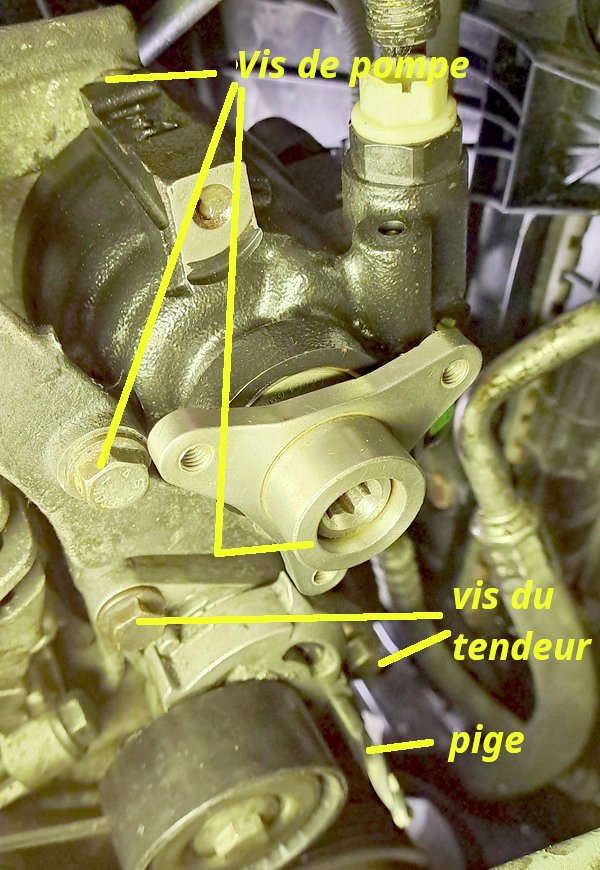 Repérez le cheminement de la courroie, notez-le et démonter cette courroie d’accessoire en relâchant le tendeur (poulie sous cette pompe) avec une clé de 13 dans le sens du vissage. Retirer la courroie et laisser repartir le tendeur tout doucement (le ressort est costaud).