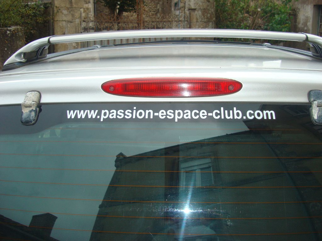 oui j'ai le petit (je viens de le recevoir) pour la lunette arrière mais je cherche à mettre la photo en contour blanc de mon espace (comme sur la carte de membre) sur la vitre arrièrePilou29 a écrit :Ben dis donc Richard, tu dates, ce sticker tu l'as vu à Romorantin en grand sur mon pare-brise et en petit sur la lunette arrière !!!