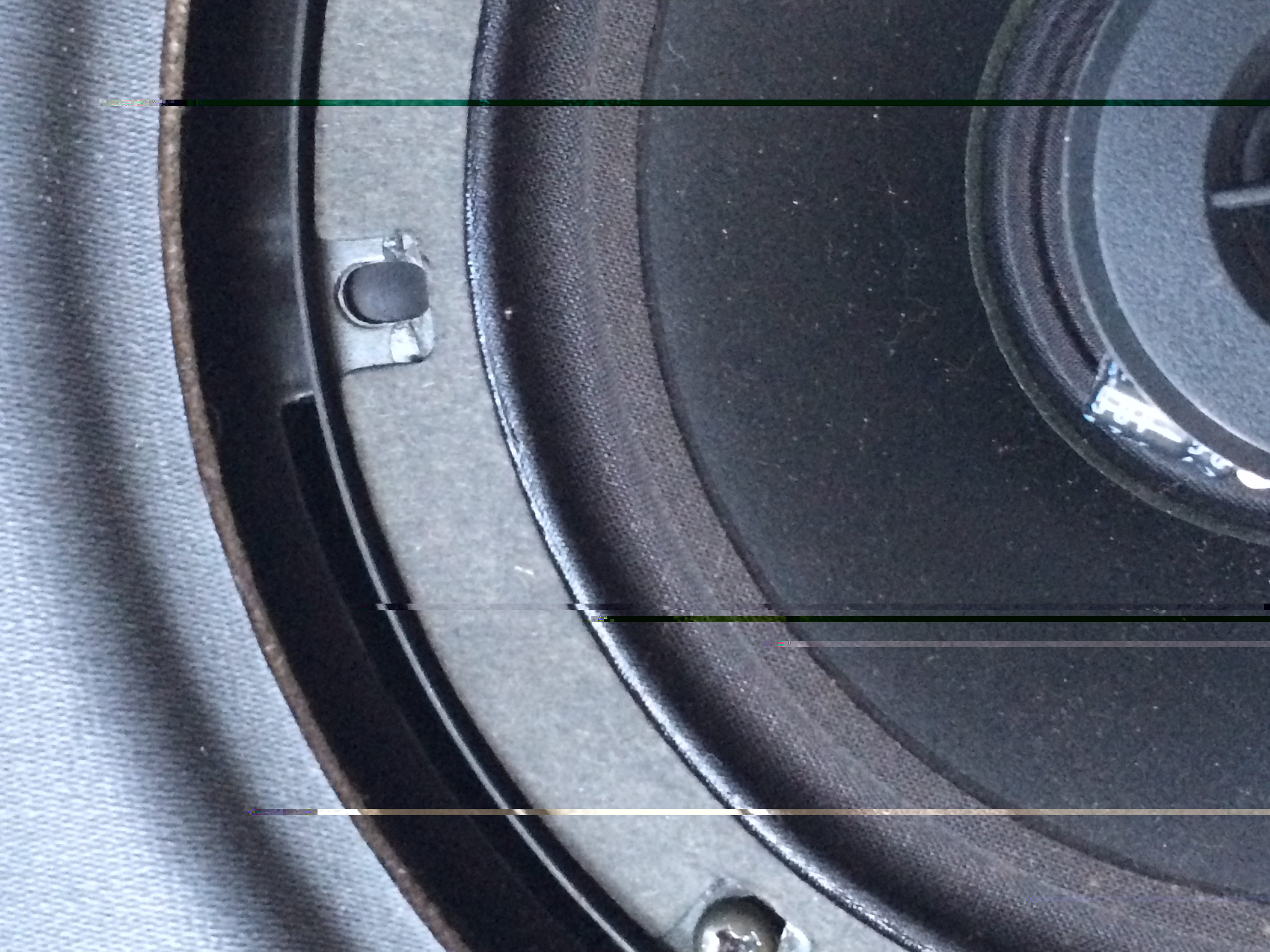 Du coup j'ai agrandi le trou qui était fait pour les HP qui avaient été installés (a priori cet espace a été vendu neuf sans installation audio, puisque j'ai la facture de l'autoradio et des HP, 1 an après l'achat) pour y rentrer les HP Philips d'origine. Puis j'ai découpé des rainures pour passer les ergots du cache. Ce qui ne va pas c'est que le cache dispose d'un sorte de lèvre, qui fait qu'il dépasse d'un bon centimètre. Pour que ce soit esthétiquement joli, il faudrait que je découpe a la taille du cache pour que la lèvre rentre, mais du coup, bien sûr, je ne pourrais plus fixer le HP...