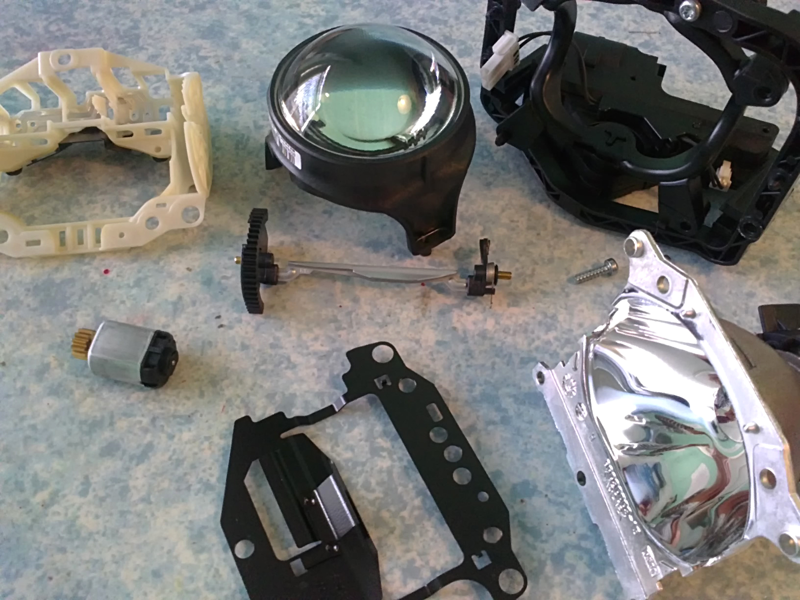 Autre détail important : dans le phare, la partie composée du feu de croisement/feu de route et du feu complémentaire halogène est constituée d'un réflecteur monté sur 3 pivots permettant le réglage (horizontal par une vis et verticale par le moteur). Le troisième pivot est fixe (en laiton ou plastique). L'ensemble mobile est clipsé sur ce pivot en force et n'est pas prévu pour être démonté. Si tu tires par l'avant, la fixation a toutes les chances de casser. Il faut opérer par l'arrière en découpant le bloc du phare (prévoir de ressouder le polypro afin de le rendre étanche une fois terminé).