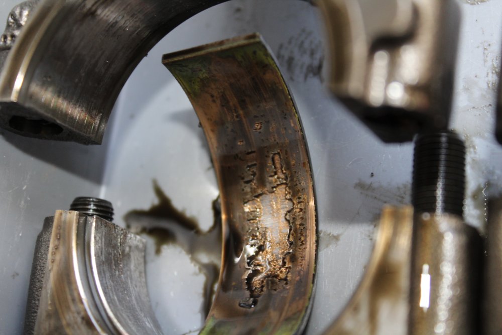 Démontage carter d'huile : c'est le drame, des lambeaux couleur laiton sont collés dans le fond