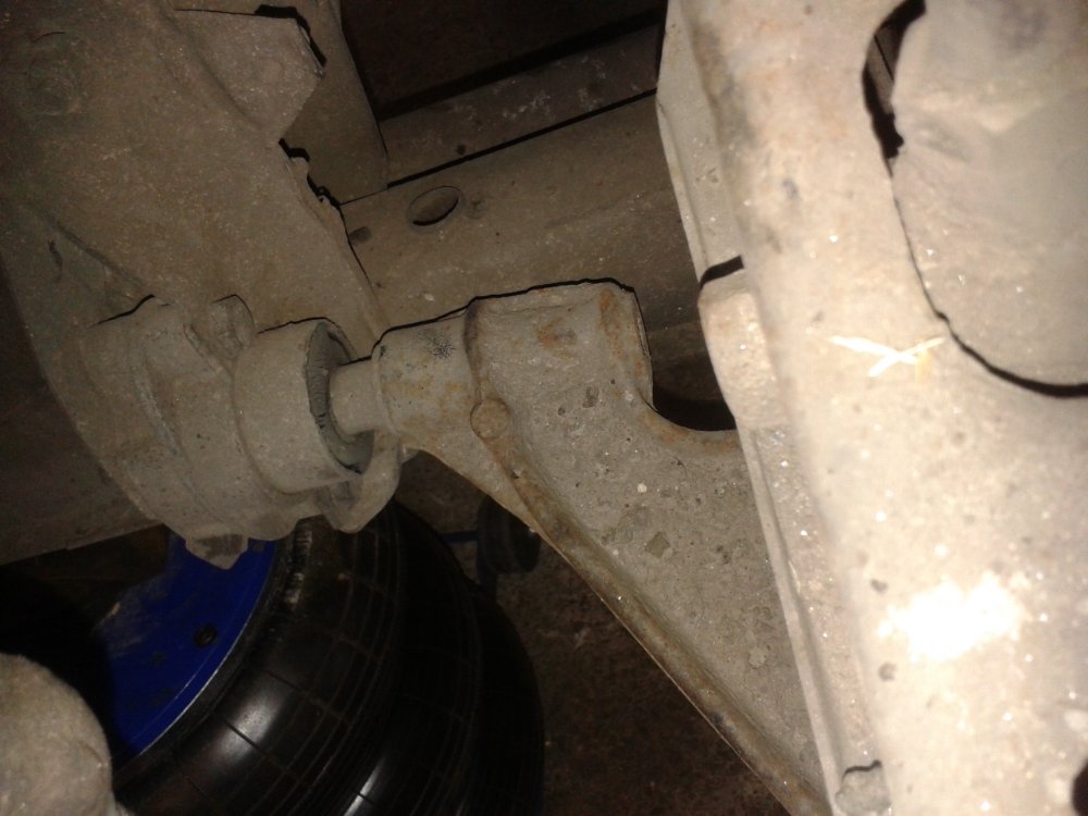 Pas pu passer sous la voiture pour vérifier, c'est trop trempé, mais j'ai l'impression que le silent bloc avant est presque collé à l'arrière de sa fixation au moins côté D.