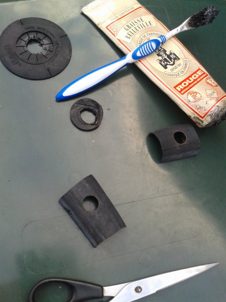 Côté conducteur je n'ai pas remis ma rondelle silicone, mais j'ai mis au moins 5 épaisseurs de chambre à air avec une couche de graisse entre chacune.