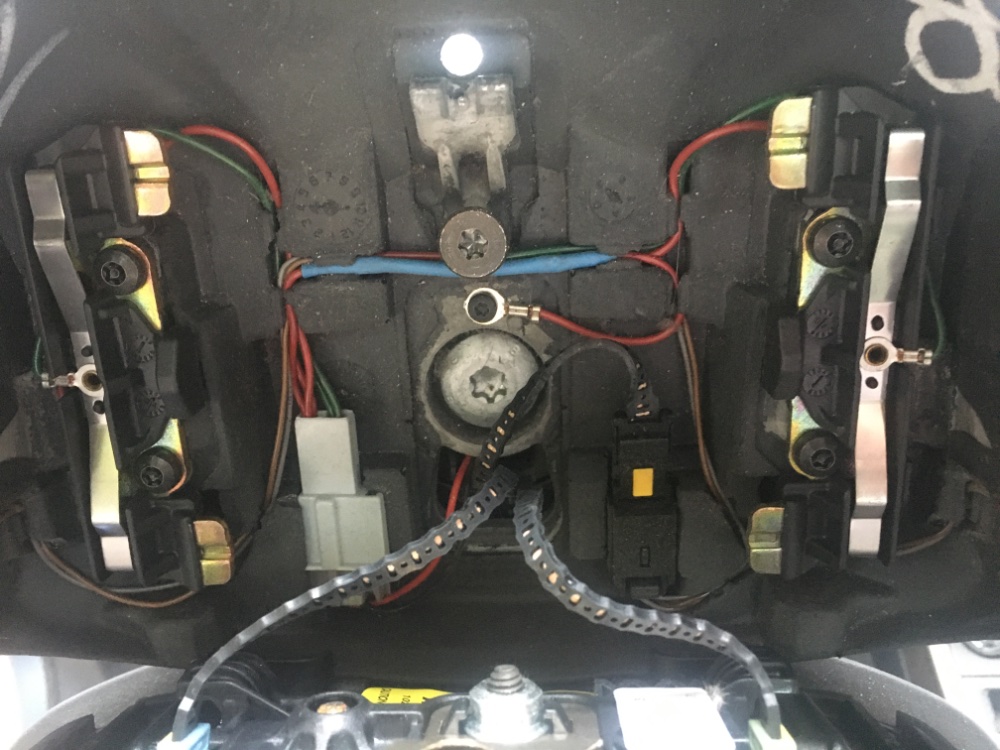 Cette réparation ne concerne que le faisceau électrique car une des pistes du circuit imprimé est coupée (dans la partie surmoulée en plastique avec les maillons). Le circuit imprimé à 6 pistes (de mémoire) enroulé dans la cassette du contacteur tournant est ensuite séparé par bandes de 2 pistes protégées par le surmoulage à maillons, c'est à ce niveau que ça casse. On remplace cette partie par un simple fil et tout fonctionne à nouveau.