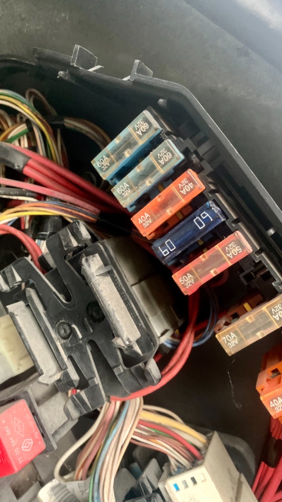 Une vue d'ensemble avec le connecteur gris raccordé (au centre un peu caché par les fusibles), et le porte fusible clipsé (contenant le 60A bleu foncé).
