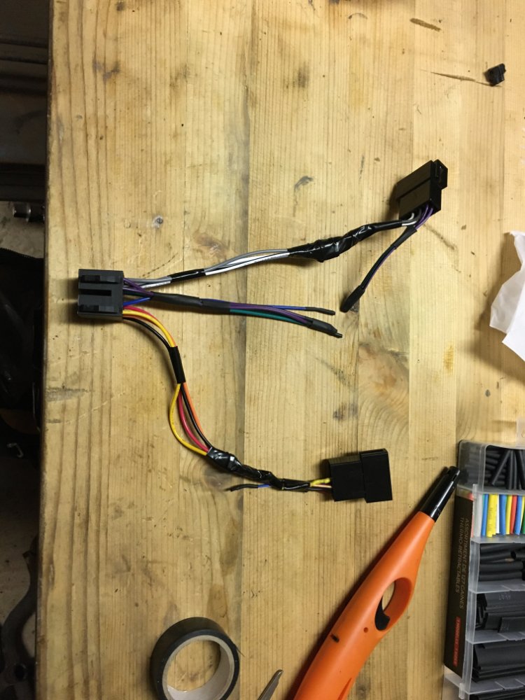 Je pense que c'est la solution la plus propre au niveau "respect du faisceau". Parce que c'est vraiment dans le connecteur marron que je sens du jeu dans les pins, et que de toucher les fils interrompt le son. Si j'ai bien compris, c'est aussi par le connecteur marron que passe le signal sonore. Le connecteur noir lui, se charge des alimentations diverses.