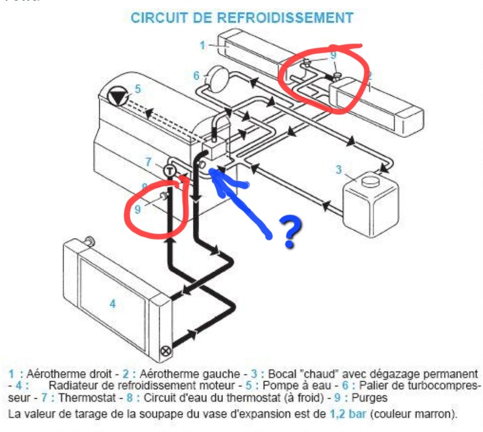 Plus en amont, tu vois le bocal de refroidissement la zone juste après quand le tuyau va du boîtier d'eau au aérothermes. Mais il est possible que tu n'en as pas, si c'est des tuyaux de deuxième monte ils ont peut-être fait l'impasse,. C'est toujours ça de gagner. Ils n'ont peut-être pas compris que des siphons remplient d'air bloquent la circulation d'eau.