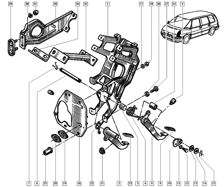 Ah oui j'y pense, le ressort entouré autour de l'axe de la pédale, qui je pense ramène la pédale vers le bas pour soulager la pression exercée par le pied du conducteur, est chez moi totalement inefficace, il flotte sans rien contraindre, tant pis, ça ne me dérangeait pas.