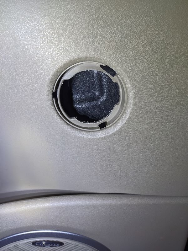 Pour les tweeters, un petit coup de dremel pour agrandir legerement le trou (on pourra toujours reposer les tweeters d'origine si besoin, on ne touche pas aux emplacements des fixations). Un leger filet de mastic transparent histoire que ca ne bouge pas.