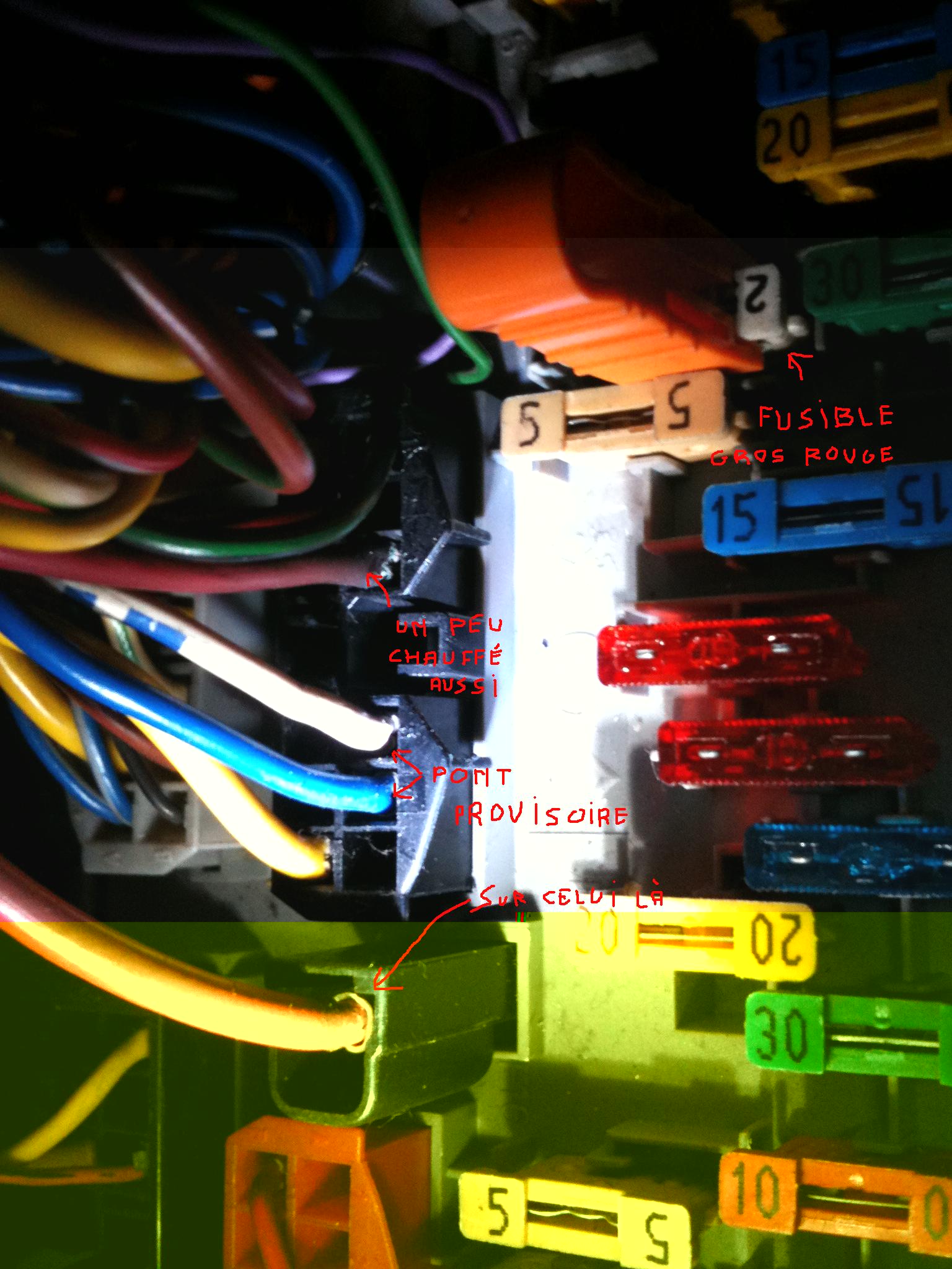 Le fil incriminé est le rouge qui part de la prise marron côté gauche quand on est face à la platine des fusibles, et placé juste avant l'ergot en plastique qui verrouille la fiche multiple marron.