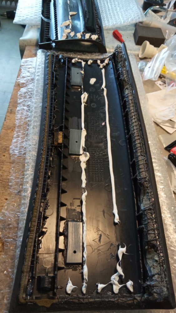 Les deux parties sont ensuite recollées. Mastic polymère blanc sur les parties longues et une colle PVC sur les 50 petits points soudés en contact (sur les deux parties). Cette colle a la particularité de dissoudre la matière ABS et réalise ensuite une soudure. Par précaution, 3 plots en PVC ont été collés dans le couvercle (et 6 sur la partie avant) munis d'un trou taraudé afin de maintenir parfaitement en place les deux parties à l'aide de vis durant le collage (et par la suite).