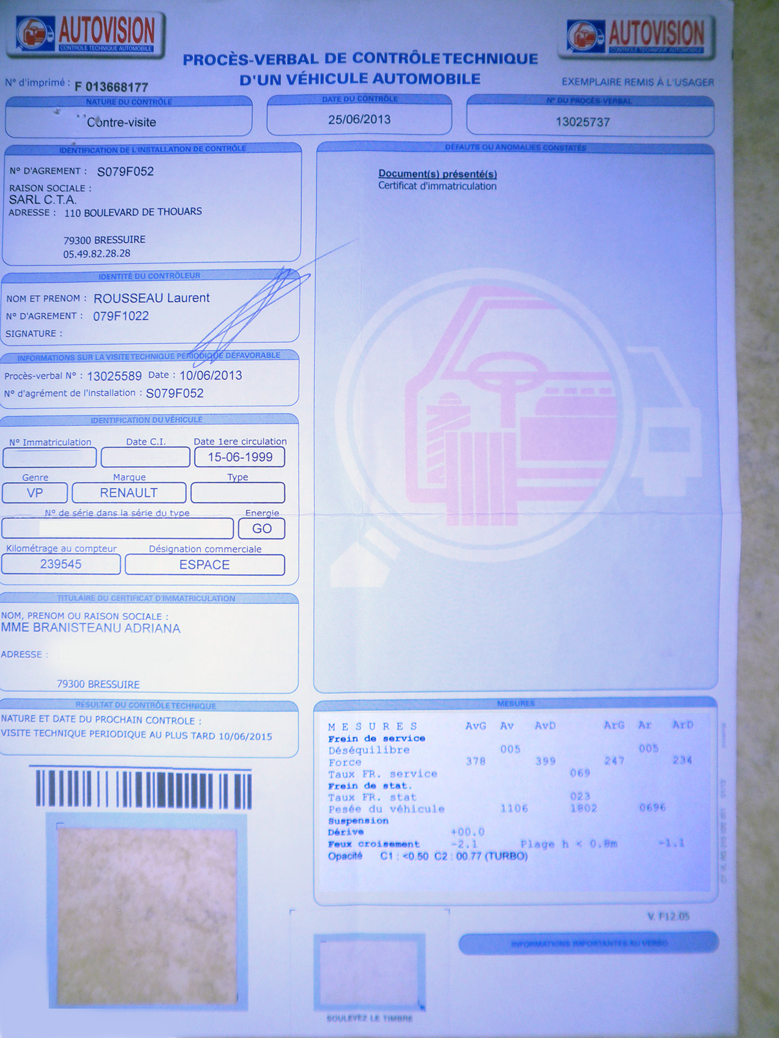 Au passage, j'ai supprimé la seconde image qui ne montre rien de plus à part le déséquilibre prévisible des freins, la date de juin 2013 du CT mais surtout avec toutes les coordonnées pour faire une fausse carte grise ...