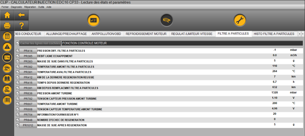 Ce qui me pose question est qu'à partir de 7kms du domicile, le calculateur considère que la régénération a réussie, et la masse de suie passe à 0g, 2g étant la masse après le premier arrêt à la station essence. Ce qui veut dire que le calculateur considère que le FAP est très propre avec un différentiel de pression amont / aval OK.