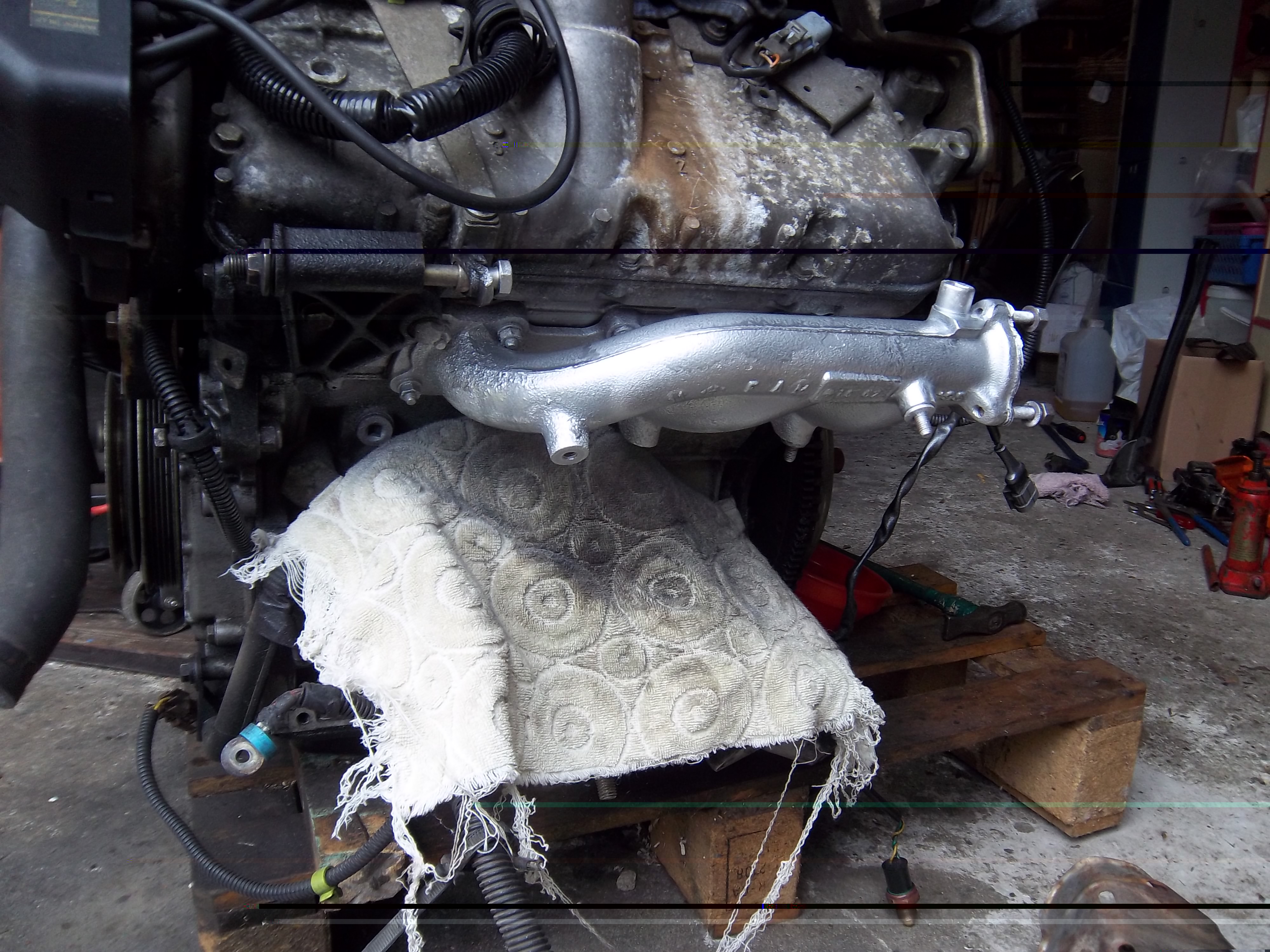 Mais bon, pas perdu mon temps quand même, boite renquillée avec l'aide de l'"adoleschiant", en 10mn, c'était réglé, remise du démarreur, des supports arrières, installation de l'échappement, et préparation du radiateur (je viens de m'apercevoir qu'il a pris un choc pendant le transport, j'espère que ce sera sans conséquences).