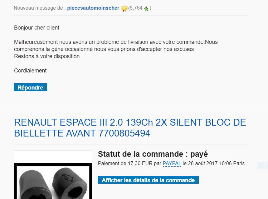 Le numéro de pièce mentionné dans l'offre de vente ebay (7700805494) est la désignation pour la biellette de barre stabilisatrice, et non la bague en caoutchouc.