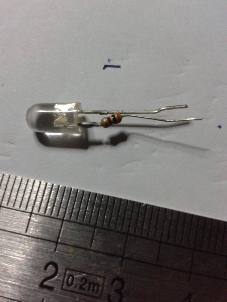 Alors tu vas voir les deux pattes qui sont repliées pour faire contact le long du support. La fine est la patte de la résistance qui dépasse, et l'autre la patte de la LED 3mm qui reste libre...