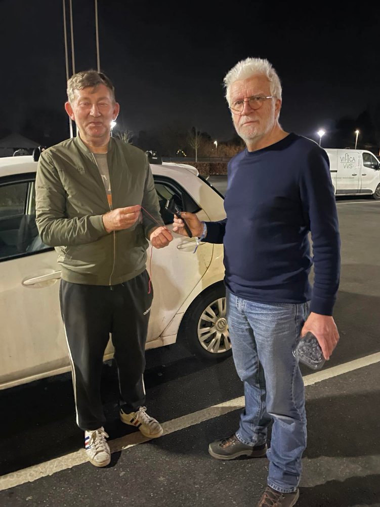 Donc, le soir, je sors le chauffage de l'habitacle, et je le pose à coté de la porte conducteur, j'installe la plaque en isorel dans la porte arrière, je passe le gros tuyau dedans et jusqu'à l'habitacle. Puis, je raccorde les deux cosses derrière le siège conducteur. Les fils ont assez petits - 2 x 2,5 mm² - pour que je claque la porte dessus sans problème. Je rentre et j'ajuste le tuyau de chauffage, et parait-il, avec la télécommande, je démarre le chauffage. J'ai appris que ce truc pompe beaucoup d'électricité pendant les premières minutes. J'ai donc prévu de le lancer avec le moteur tournant, afin que cela soit l'alternateur qui fournisse le jus et non la batterie. Je vais faire un test dès que possible. Si cela ne marche pas, je devrai rajouter une batterie. Justement, j'en ai mis une neuve sous le capot. Je pourrai donc utiliser l'ancienne.