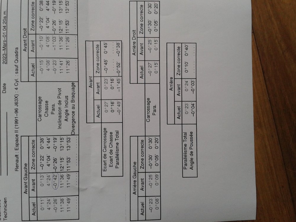 Du coup j'essaye de comprendre sur mon 2, vu que le carrossage n'est pas réglable et que les valeurs (roues droites) D et G sont respectivement -0°15' et +0°11', ça ne risque pas de s'arranger en mesurant roues braquées à +/-20°... donc si j'applique le calcul comme dans la vidéo mon résultat sera une valeur différente pour chaque roue. Dans ce cas quelle valeur choisir comme référence, une moyenne des deux, ou une des deux au hasard?