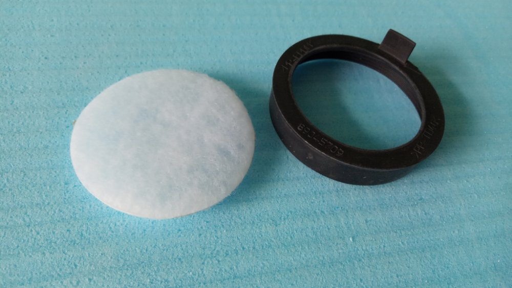 J'ai alors réalisé un filtre placé dans le bouchon souple du phare. Le bouchon est percé d'un trou de Ø 56 mm à la scie cloche et du filtre pour hotte est découpé à l'aide d'un appareil avec lame chaude en suivant le tour d'une boîte de conserve en métal de Ø 75 mm. Le bord est soudé, c'est propre, net et rapide.