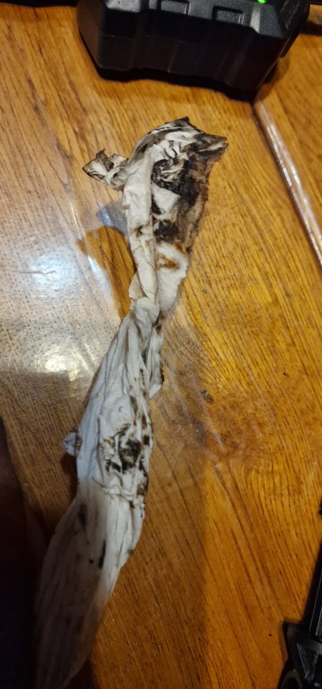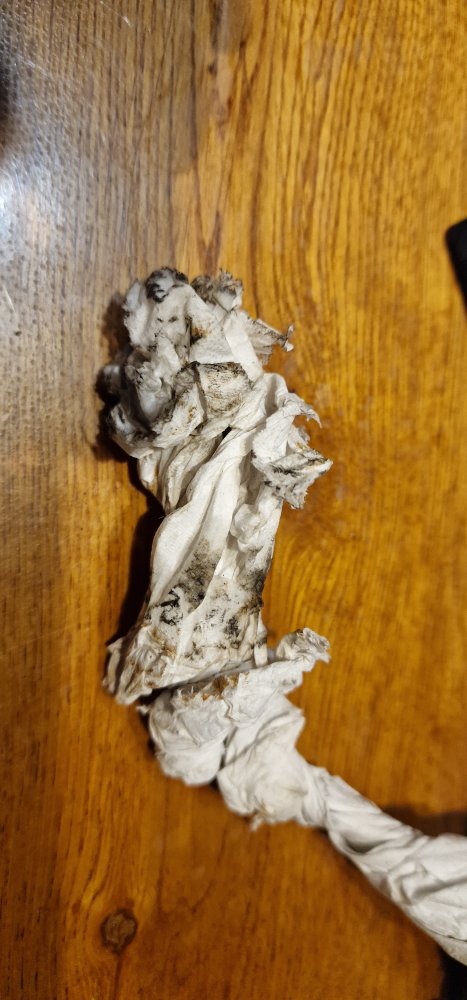 En voyant l'état j'ai finalement décidé de renlever l'émetteur remplaçant pour lui faire aussi un contrôle intérieur .. dommage il y était presque, mais inutile de s'emmerder des heures à le remettre en place s'il est rongé lui aussi ... résultat il est un peu abîmé mais ça reste acceptable ... très léger et délicat passage au papier de verre très très fin sur la partie abîmée pour retirer les aspérités et éviter ainsi de niquer le plastique du corps avec le temps ... un coup de chiffon aussi à l'intérieur du corps, et vu la couleur des 3 ou 4 chiffons successifs imbibés de nettoyant freins, c'était pas totalement inutile ...