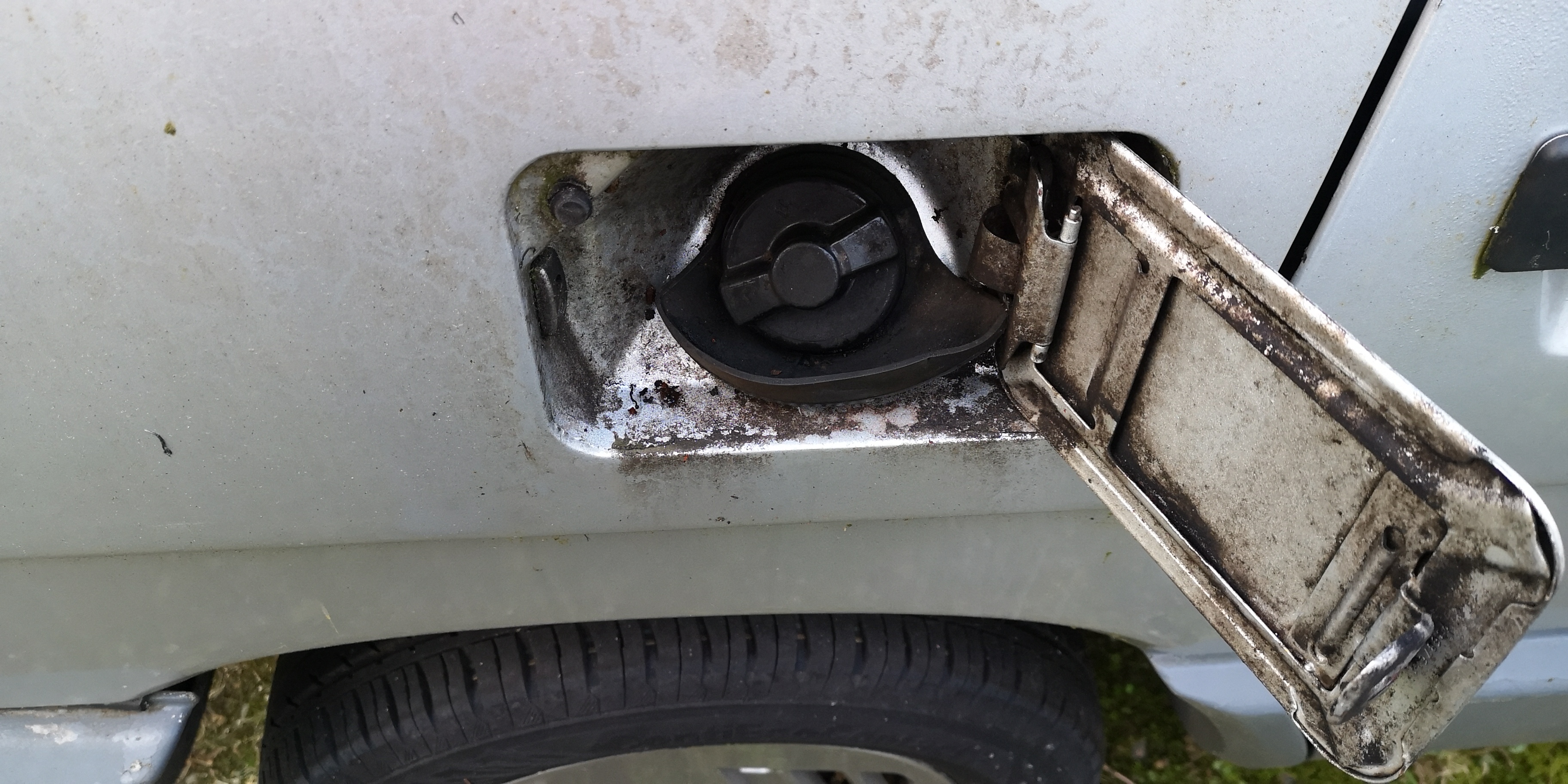 Direction le réservoir et surprise en ouvrant la trappe : entourant la goulotte de remplissage il y a un superbe joint caoutchouc formant réservoir empêchant en cas de débordement ou refoulement du réservoir l'essence de se rependre sur la carrosserie.