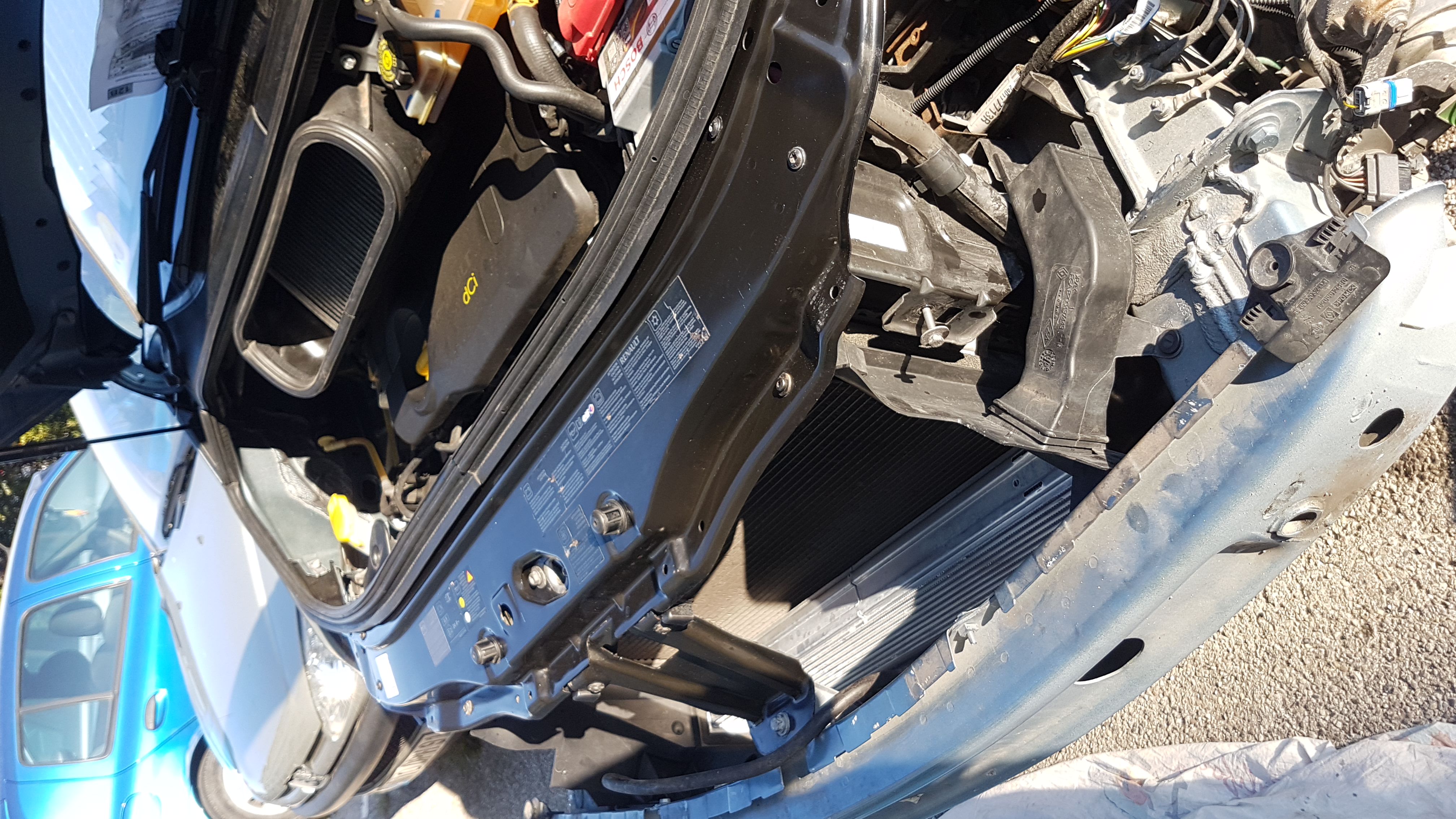 Tout d'abord mettre la voiture sur chandelles: Ensuite apres avoir déposé les deux phares et le par-choc ça donne à peu prés ça: Voila ou j'ai aperçu la fuite: Il faut ensuite démonté la traverse supérieur 11 vis de 13 Bonjour l'échangeur! Il y a deux agrafes en dessous a viré et les deux durite de l'échangeur, ensuite soulever le tous pour dégager l’échangeur qui sort par le haut et qui est juste clipsé.
