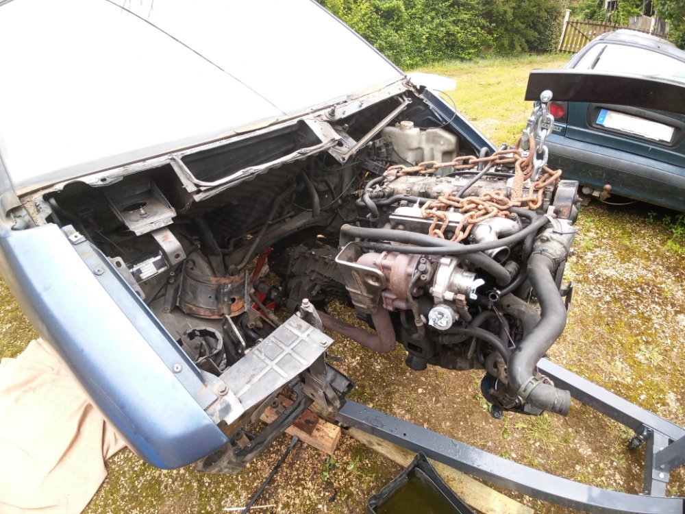 J'ai réussi à sortir sans trop d'encombre le moteur, seul le support de boîte côté passager a morflé (erreur de ma part).