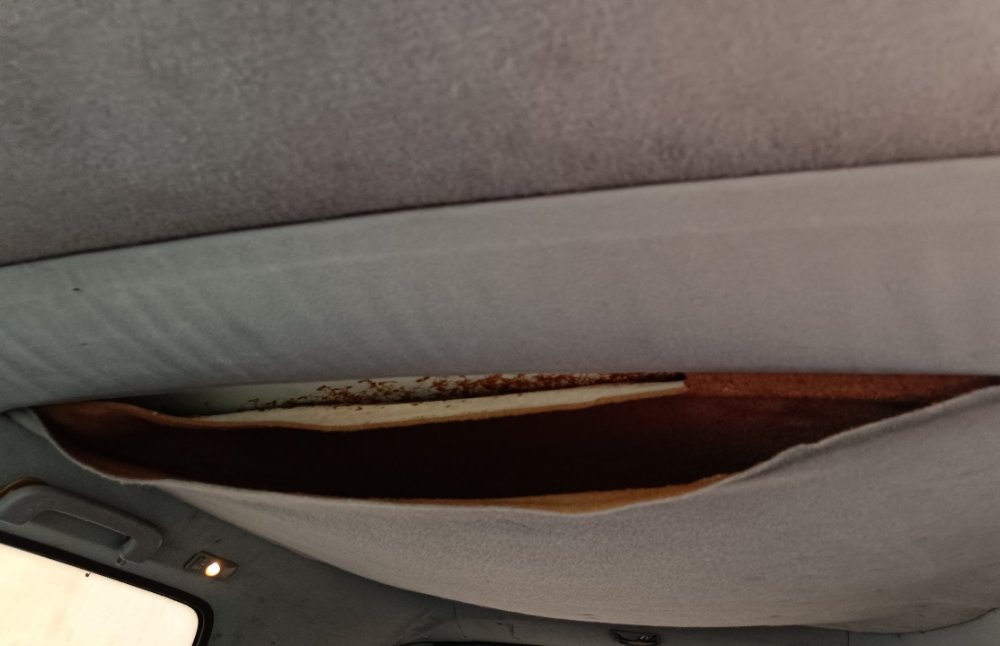 Partie arrière : Le ciel de toit est complètement décollé, laissant apparaître la mousse et la surface en dessous de cette dernière.