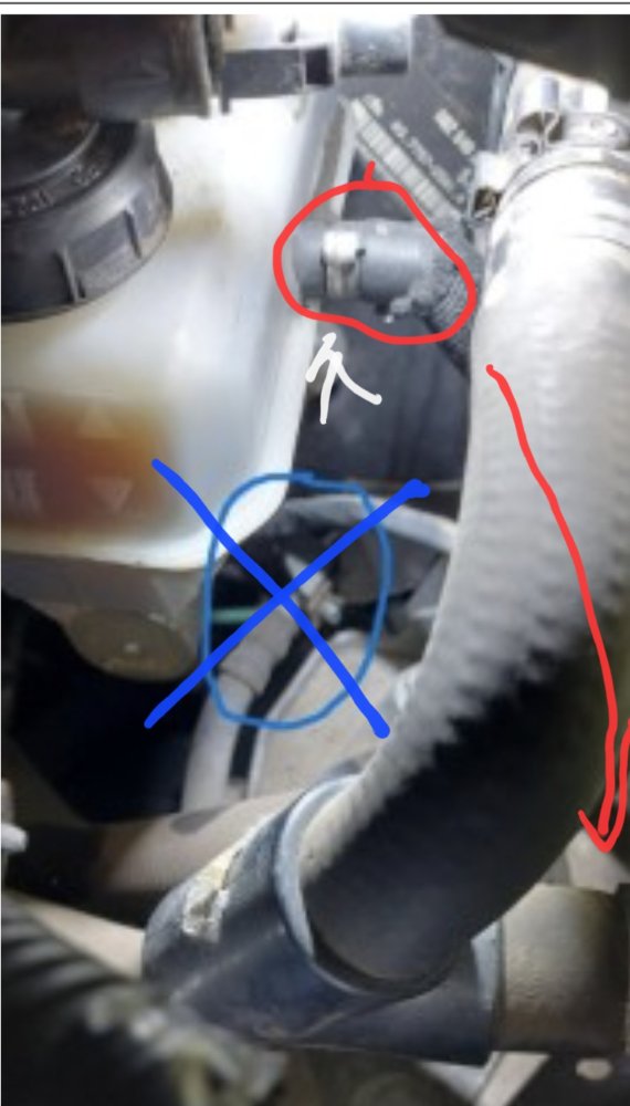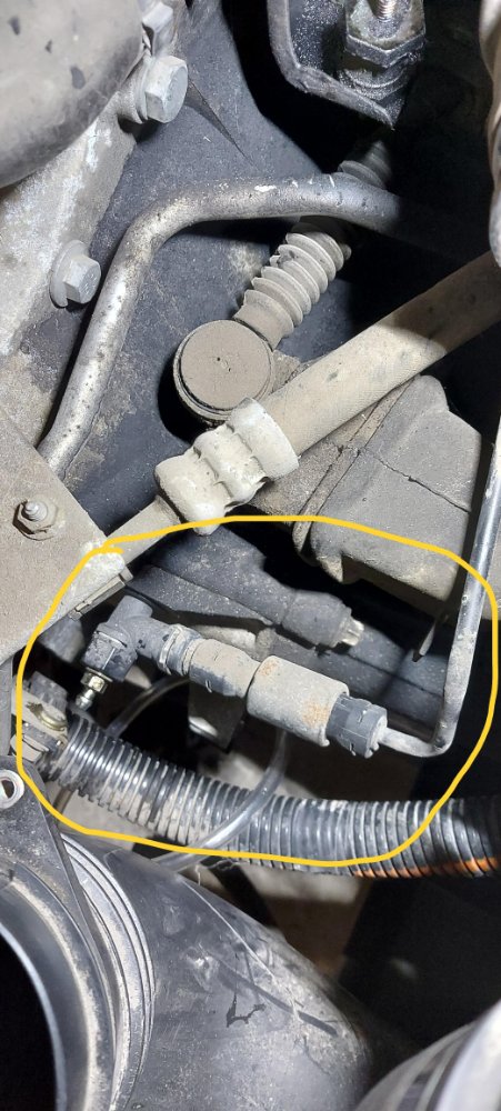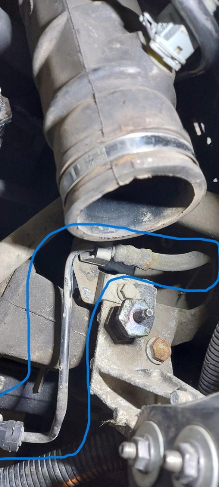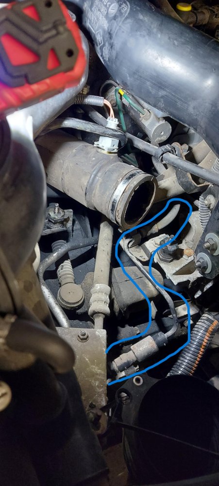 Ce que tu montres encerclé en bleu est le tuyau HP de direction assistée, pour cette raison je l'ai barré.