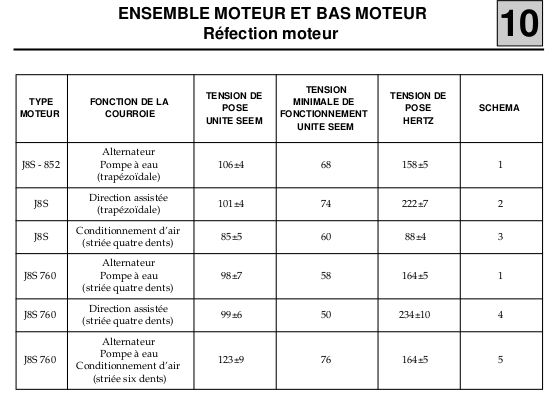 Pour voir si la tension des courroies est dans les clous, voici les tensions de pose (faut compter une bonne dérive avec une courroie usée, mais tout de même faire appel au bon sens):