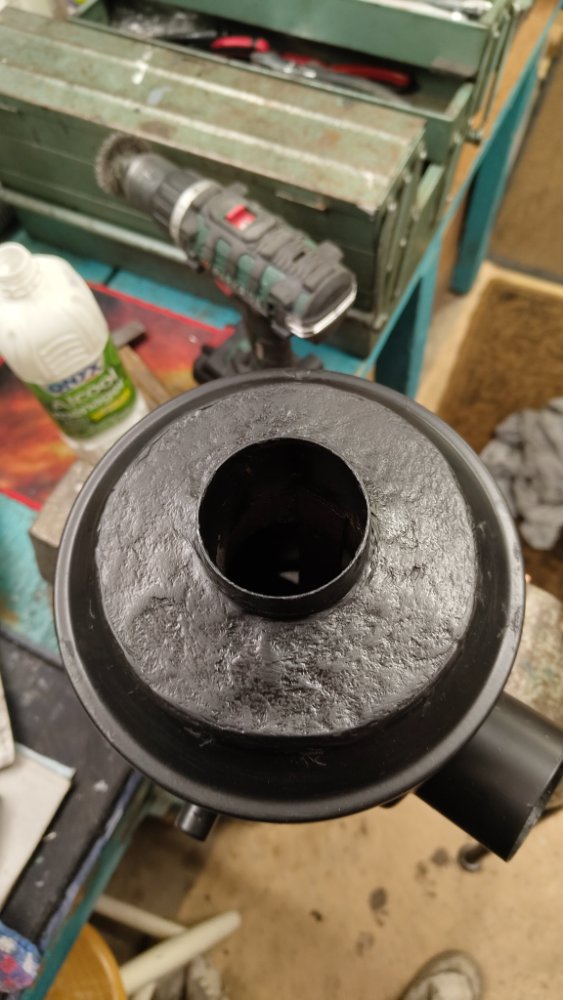 J’ai acheté un raccord souple en 50 mm, quelques coudes du même diamètre et j’ai assemblé le tout à la colle néoprène. J’ai ajouté une petite grille à l’avant pour protéger l’entrée, histoire de faire les choses bien.