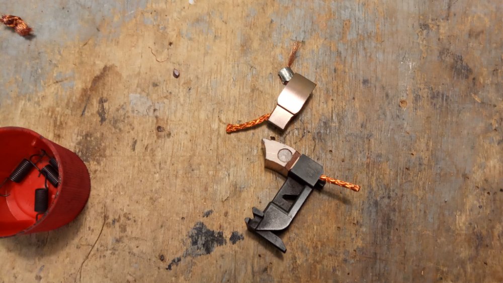 Chaque paire de charbon se démonte facilement (bien prendre des photos pour le remontage et l'affectation des différents câbles). Ici, les charbons d'origine après 19 ans d'usure.