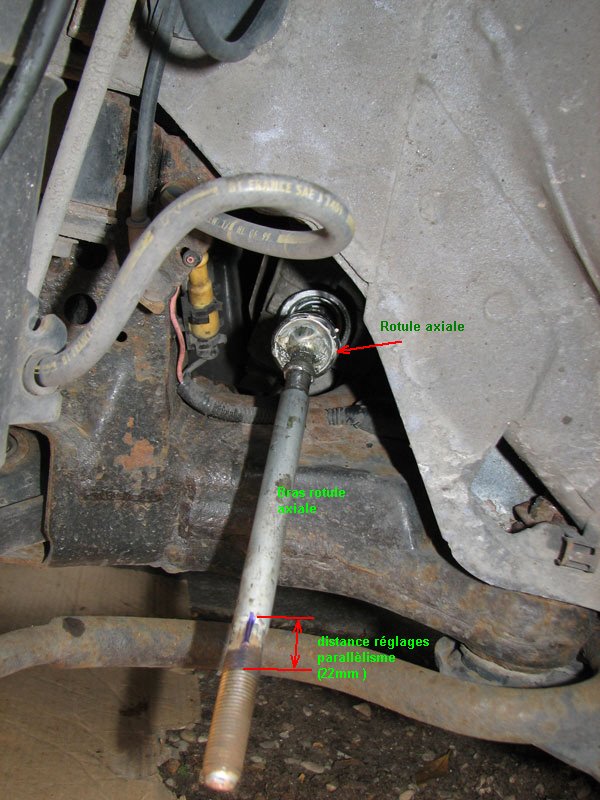 Voici le bras à rotule axiale nu: (avec la marque de l'alignement, on peut aussi observer la distance de réglage du parallélisme) L'ancien soufflet fendu, et le nouveau en remplacement: 7) graisser un peu l'intérieur du soufflet sur les épaulements à chaque extrémité, cela facilitera le passage et la mise en place.