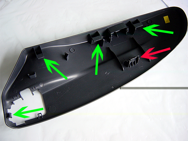 4. Retirer la garniture coté intérieur (un ergot à déplacer en partie inférieure accessible sous le siège au dessus du cylindre du prétensionneur / voir flèche rouge). La garniture est maintenue par 3 pattes, il suffit de la glisser vers le haut pour l'extraire, une fois l'ergot du bas dégagé. Un dernier ergot se trouve à l'extrémité.