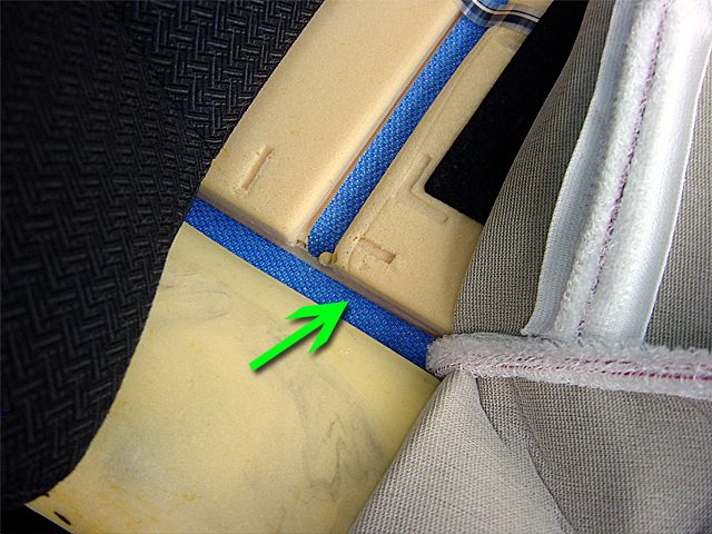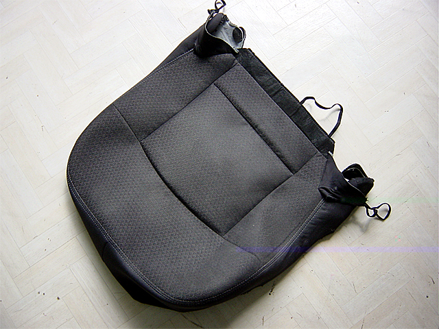12. Retirer les 2 élastiques de la coiffe de l'assise (ils sont cousus sur une grande languette de matière plastique). Couper les 2 agrafes métalliques qui retiennent les élastiques derrière la coiffe du dossier et dégager l'élastique du rabat de l'air-bag latéral. Prendre des photos AVANT le démontage permet de retrouver la position de chaque élastique. Retirer les 2 agrafes métalliques situées sur les cotés à l'arrière du siège (maintien de la coiffe).