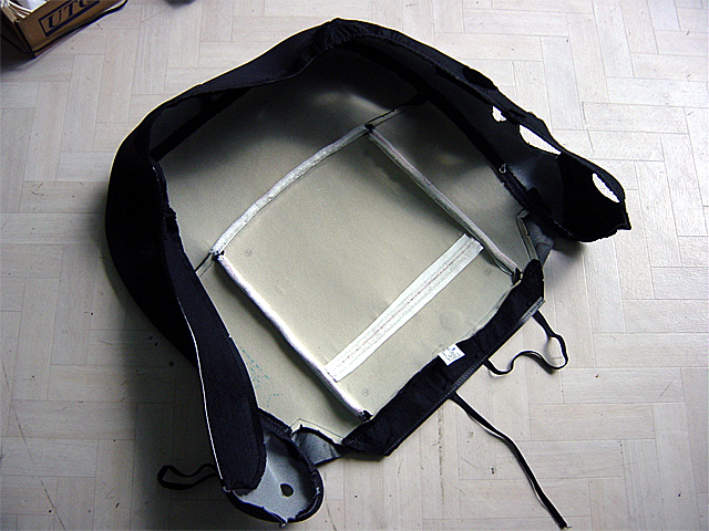 Remise en place de l'ensemble avec positionnement des bandes Velcro en premier. Remplacer les 2 agrafes métalliques coupées (au dos du siège) par des liens en nylon (RILSAN).