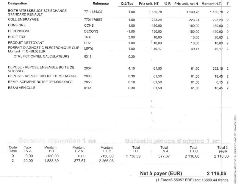 En 2009,j'ai fait changé ma boite JC5 en échange standard, je poste la facture du changement de boite chez Renault.Si cela peut aider pour les références.