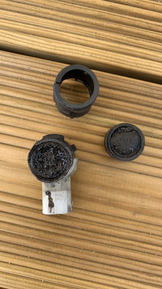 Déjà gros coup de bol il a été épargné par la série d'orages de grêle qui a frappé la Gironde cette semaine (ce qui n'est malheureusement pas le cas de ses copines, restées dans le jardin faute de garage...). En contrepartie, un ami est venu lui faire un bisou en manoeuvrant avec sa fiesta... Pas de gros dégâts apparents (choc à +-20km/h) mais au moment de repartir plus de radar de recul et un biiiiiip continu... Pas besoin de chercher très loin, le capteur gauche s'est fissuré lors du choc -> énième passage à la casse -> récupération d'un faisceau complet et remplacement du capteur seul -> tout remarche ! Et il n'y a pas besoin d'inspecter le capteur très longtemps pour comprendre ce qui merdait : Le démontage du parechoc est vraiment facile même tout seul, à noter que sur les phase 1 (mon donneur en tout cas, un court) il y a une plaque en nid d'abeille à l'intérieur rivetée par dessus le capteur ARG rendant le démontage un peu plus fastidieux, curieusement je n'ai pas retrouvé cette plaque sur mon phase 2 je ne sais pas si c'est normal (tant mieux pour le remontage).