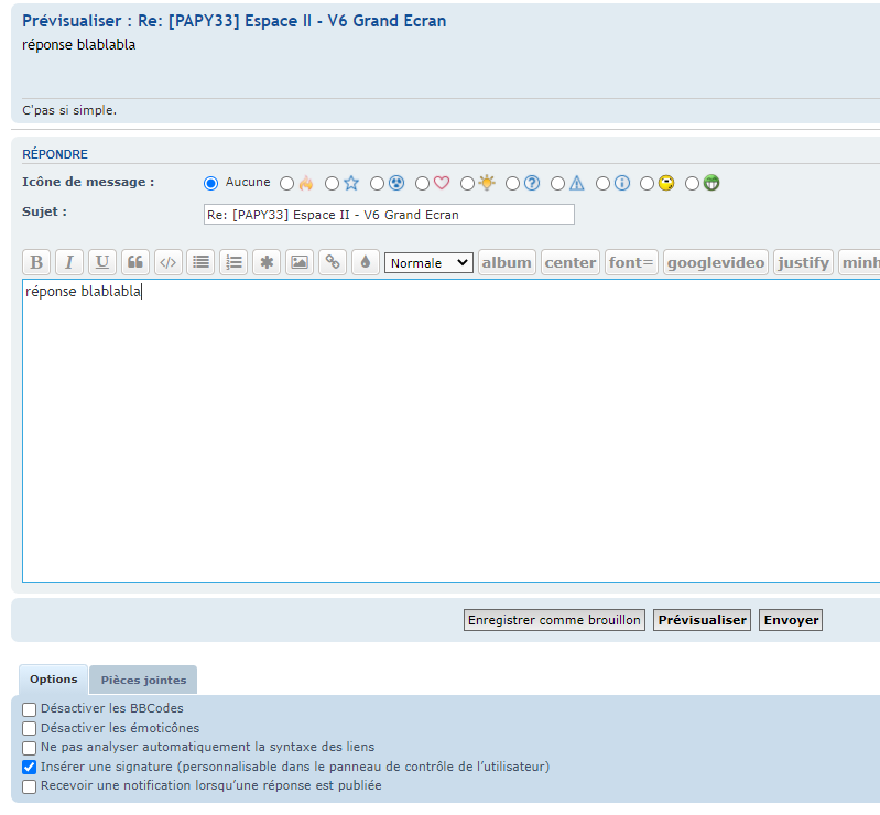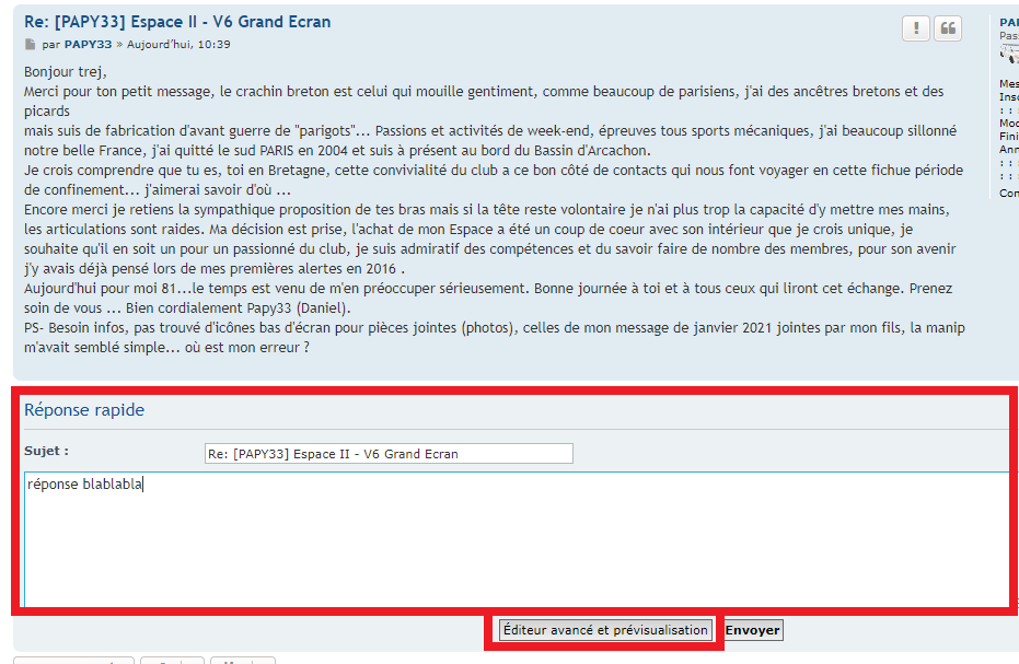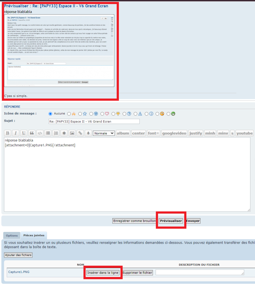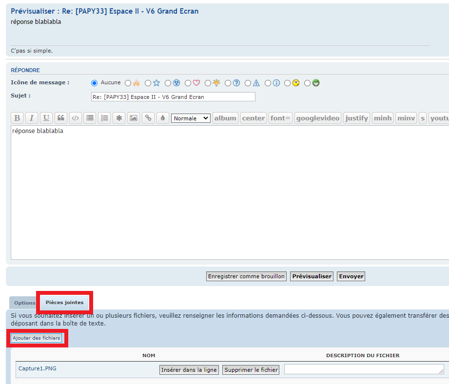 Tu avais déjà été un des premiers à me répondre à mon pb injecteur et c'est vrai que j'avais été emballé par mon essai d'un V6 boite auto grand écran d'un beau rouge, mais un vrai coup de coeur, j'ai craqué en découvrant le vert et son intérieur pour mon projet GPL. A tout point de vue que du bonheur sur la route pendant toutes ces années, dans la grande concession Renault, le jeune qui m'a fait la transfo était fana du PRV. J'ai suivi tous ses conseils. Mon auto formation ordi me pose problème, je voudrais réessayer de joindre quelques photos en pièces jointes mais je ne trouve toujours pas la fameuse icône pièces jointes d'Eric et ... wahou !! à ton explication je viens d'avoir un super exemple envoyé par "trej", mon cadeau d'anniversaire cette fois je dois m'accrocher, je viens de joindre mon DD archives photos... ok pour cliquer sur Ajouter des fichiers ...je tente ..ok choix photos clic sur une choisie, me propose ouvrir mais pas ]insérer[, comment faire pour en mettre plusieurs ? j'y retourne