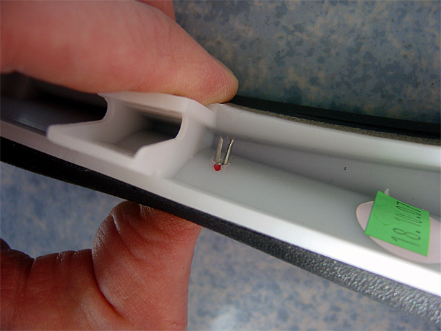 4. Le résultat : 5. Pour plus de facilité, j'ai utilisé des attaches bifurquées en métal 6. Pose des attaches bifurquées. Ces attaches ont l'avantage d'avoir une tête plate et se posent facilement. Le but étant de plaquer le revêtement en PVC contre la structure rigide en ABS. 7. Le résultat : Naturellement, une fois le montage terminé, les attaches ne se voient pas. A présent, le bandeau supérieur se tient à bonne distance du portillon et ne vient plus frotter, évitant les risques d'arrachement mécanique du revêtement. Comme la mousse a été uniquement retirée sur une partie non visible, aucune modification n'apparaît sur la planche de bord. C'est tellement logique qu'il est stupide que les concepteurs de la planche n'aient pas pensé à ce détail (il suffisait de faire "maigrir" le coté de ce bandeau).