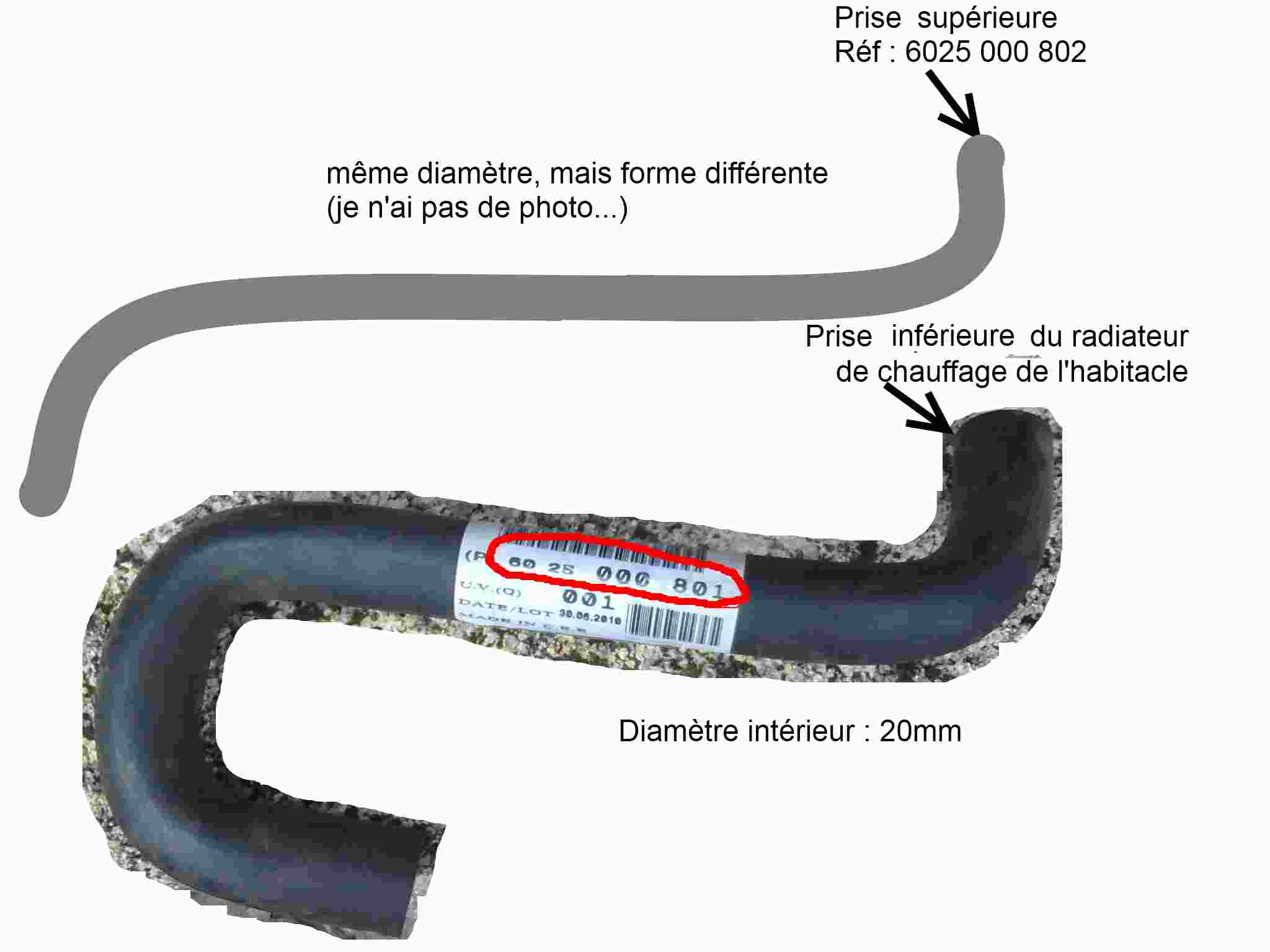 Le gars de chez Renault m'avait dit que la réf de la durite supérieure etait la xxxxx 801. C'est ce que j'avais indiqué dans mon 1ier post. En fait, la durite supérieure a la référence XXXXX 802.