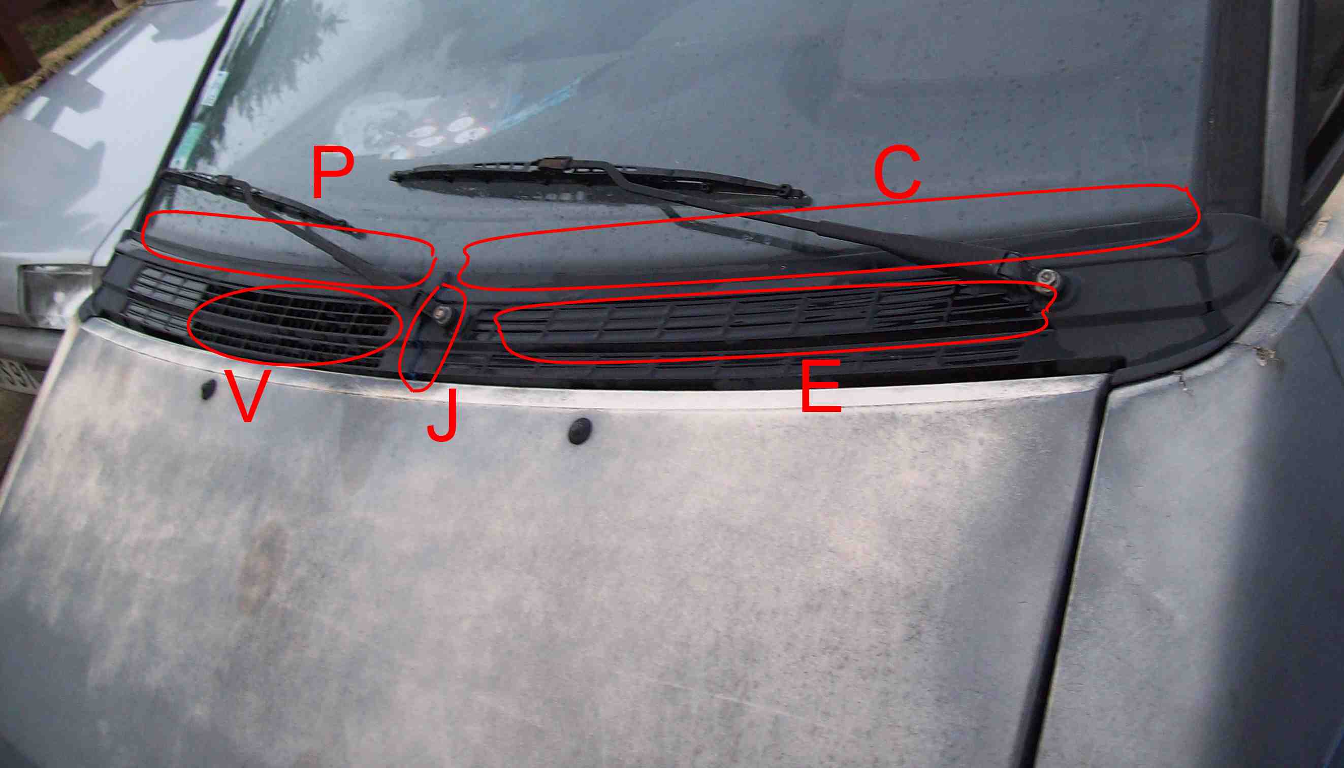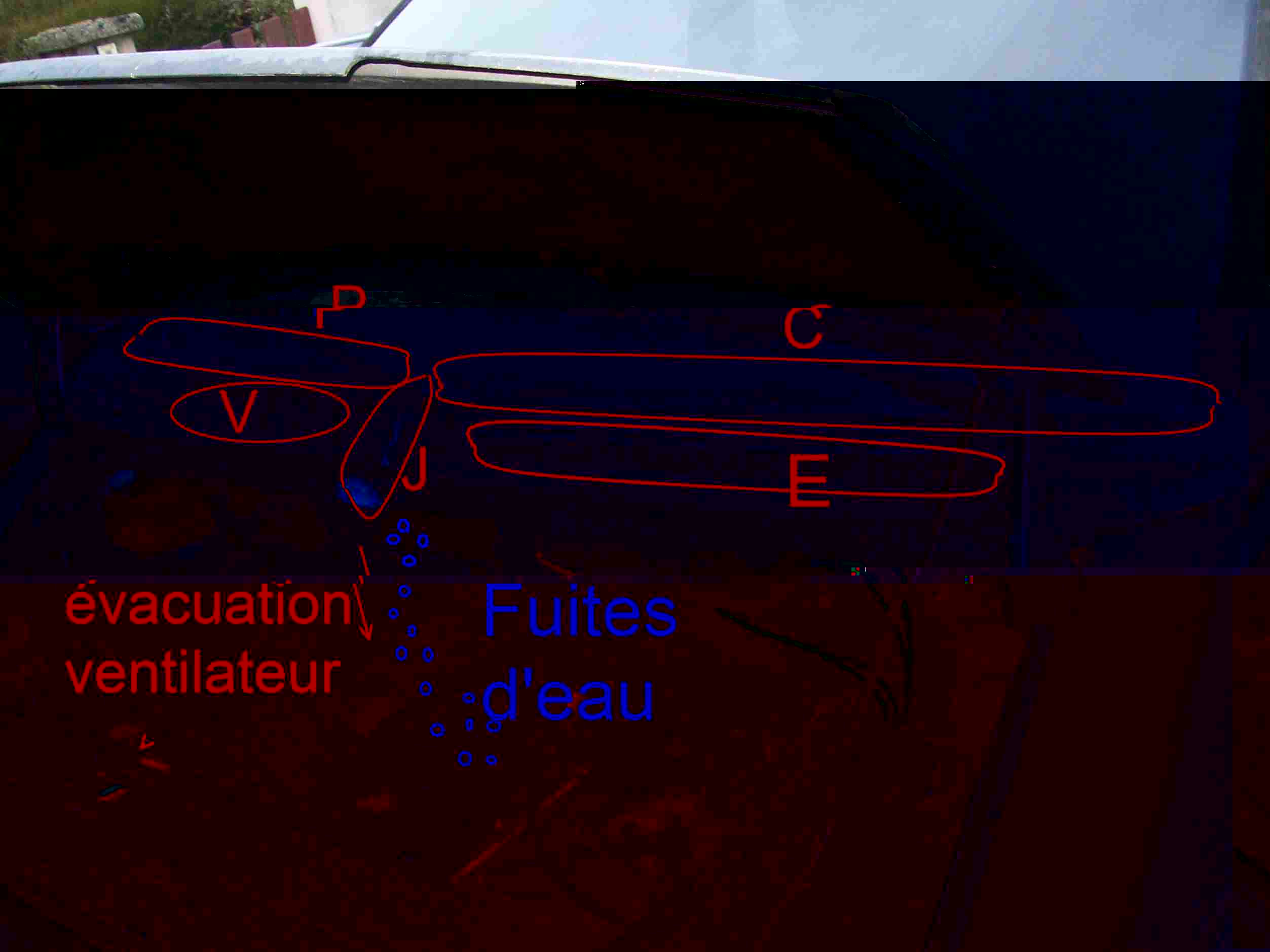 En versant de l'eau sur le pare-brise, l'eau coule sous les pièces en plastique (V) et (E), car elles ne sont pas jointives avec le pare-brise.