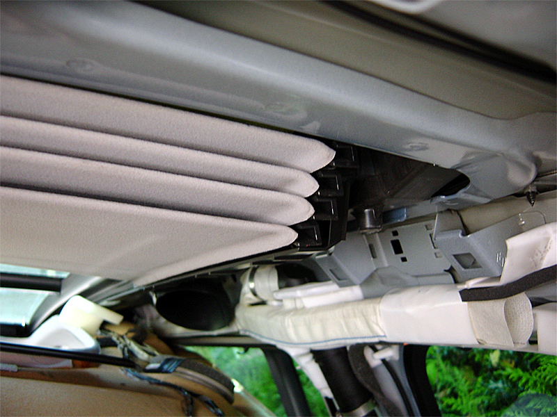Le fait de libérer seulement l'arrière de la garniture de toit permet d'accéder aux vis nécessaires à cette modification. Astuce : pour éviter que les bandes de Velcro ne se collent durant la modification, placer des morceaux de mousse intermédiaires (les compter afin de les récupérer en totalité avant de tout reposer).