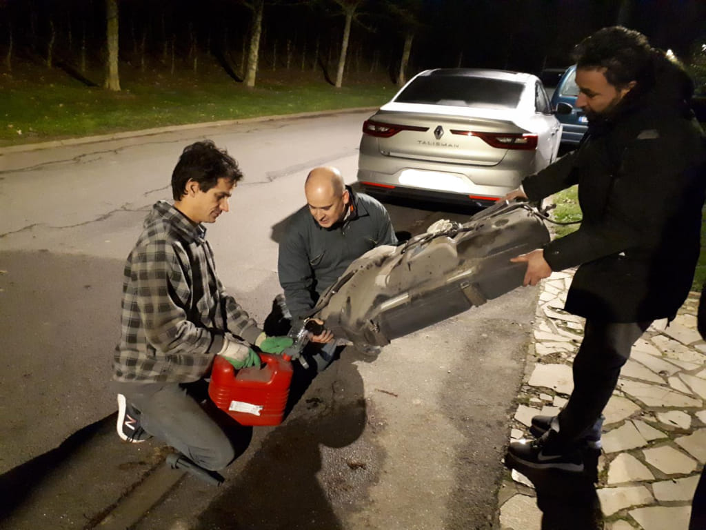 Pour faire simple, on décide de tomber le réservoir pour voir où cela fuit,il commence à faire nuit