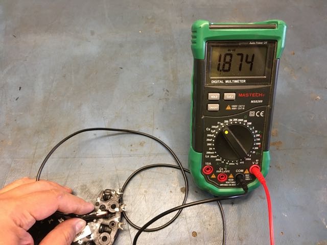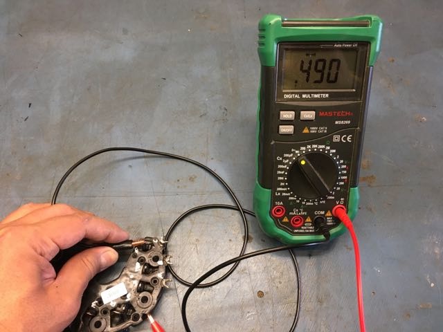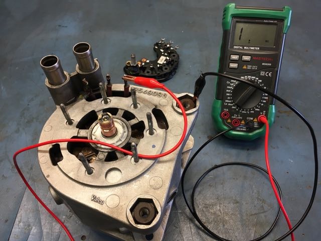 • J’ai fait quelques contrôles: (a) Continuité entre les bagues collectrices du rotor: OK; (b) Pas de continuité entre les bagues collectrices et le corps de l’alternateur (masse): OK