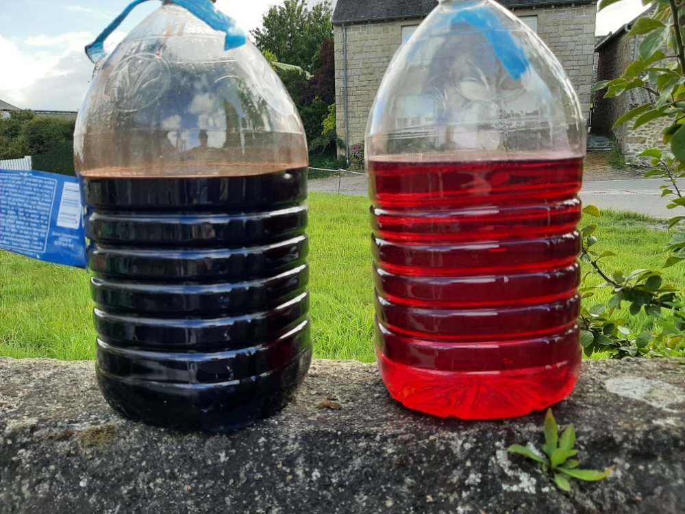 - j'ai utilisé deux bidon d'eau de 5L : 1 pour recueillir l'huile usagée, un pour faire le mélange huile neuve / 2% P18 (et avoir a peu près le même niveau)