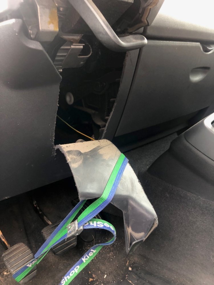 Bonjour de Ratzeburg en Allemagne ! J'ai maintenant trouvé une méthode rapide et efficace pour retirer le blocage du volant. Vous enlevez la protection plastique du volant avec deux torx 20 puis sciez le cache plastique inférieur latéralement avec une lame de scie à métaux normale à environ 15 à 20 cm comme indiqué sur la photo. (Après avoir terminé le travail, scellez le plastique avec du Sikaflex) Tirez ensuite le plastique vers le bas avec une courroie de tension et vous pourrez facilement accéder à la pièce. No 30 Torx à gauche (sens anti-horaire) Attention : Avent de demonter la vis appuyez sur le bouton marche/arrêt pour déverrouiller le verrou. maintenant tournez la vis torx ! Ne forcez pas - il y a une attelle de sécurité dans la boîte - cela verrouille la serrure de façon permanente si vous la tournez contre une resistance forte et elle se verrouillera définitivement à long terme.