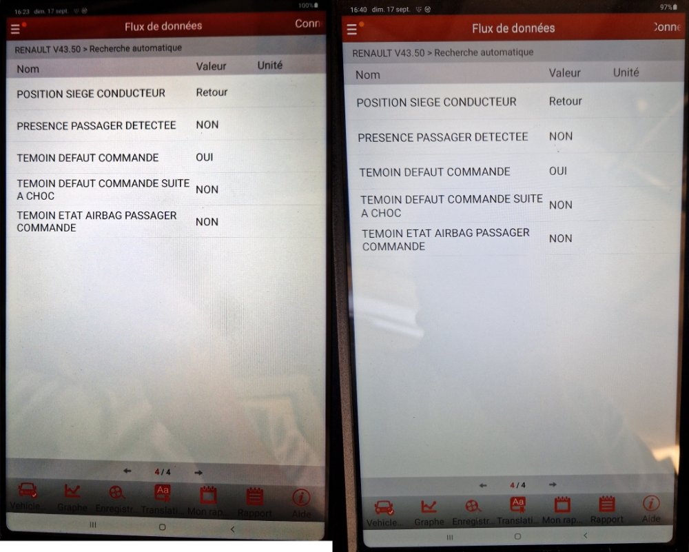 J'ai contrôlé la continuité des fils du bout de la fiche du prétentionneur jusqu'à la grosse connectique qui se trouve sous la moquette du plancher sous le siège mais rien à faire impossible d'effacer le défaut, il revient systématiquement dès lors que je l'efface à la valise.